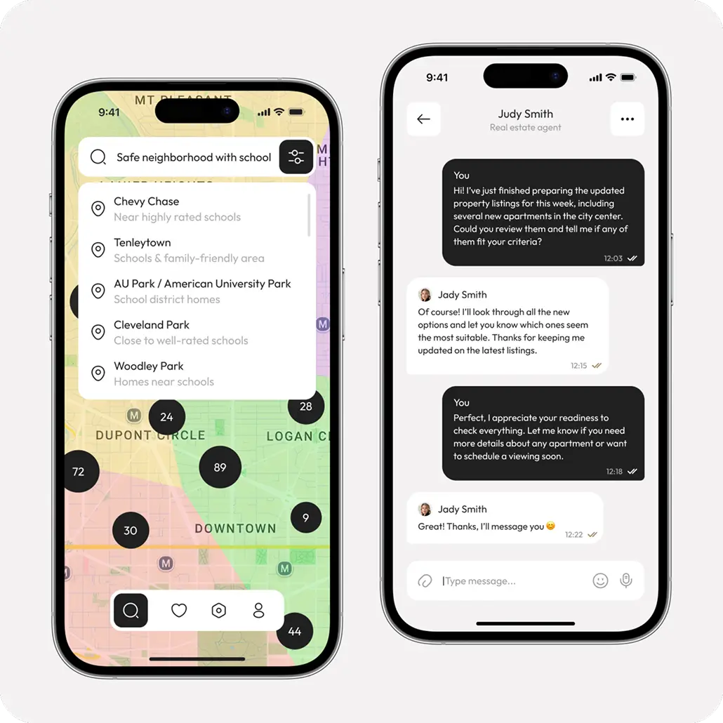 The map-based search acts as the launchpad, with clustered pins and heatmaps surfacing listings in real US neighborhoods. Each listing page features immersive imagery, local school and transit info, and instant “Contact Agent” chat. The user dashboard keeps favorites, alerts, and recent interactions at a glance.