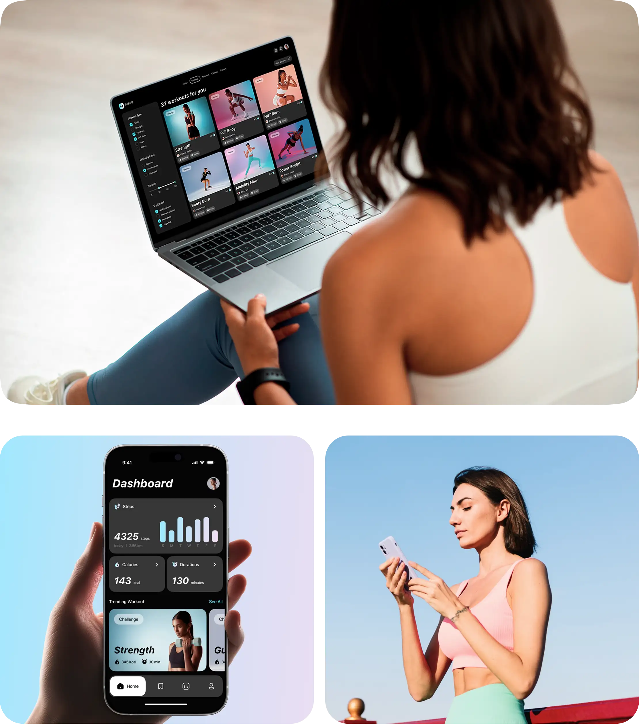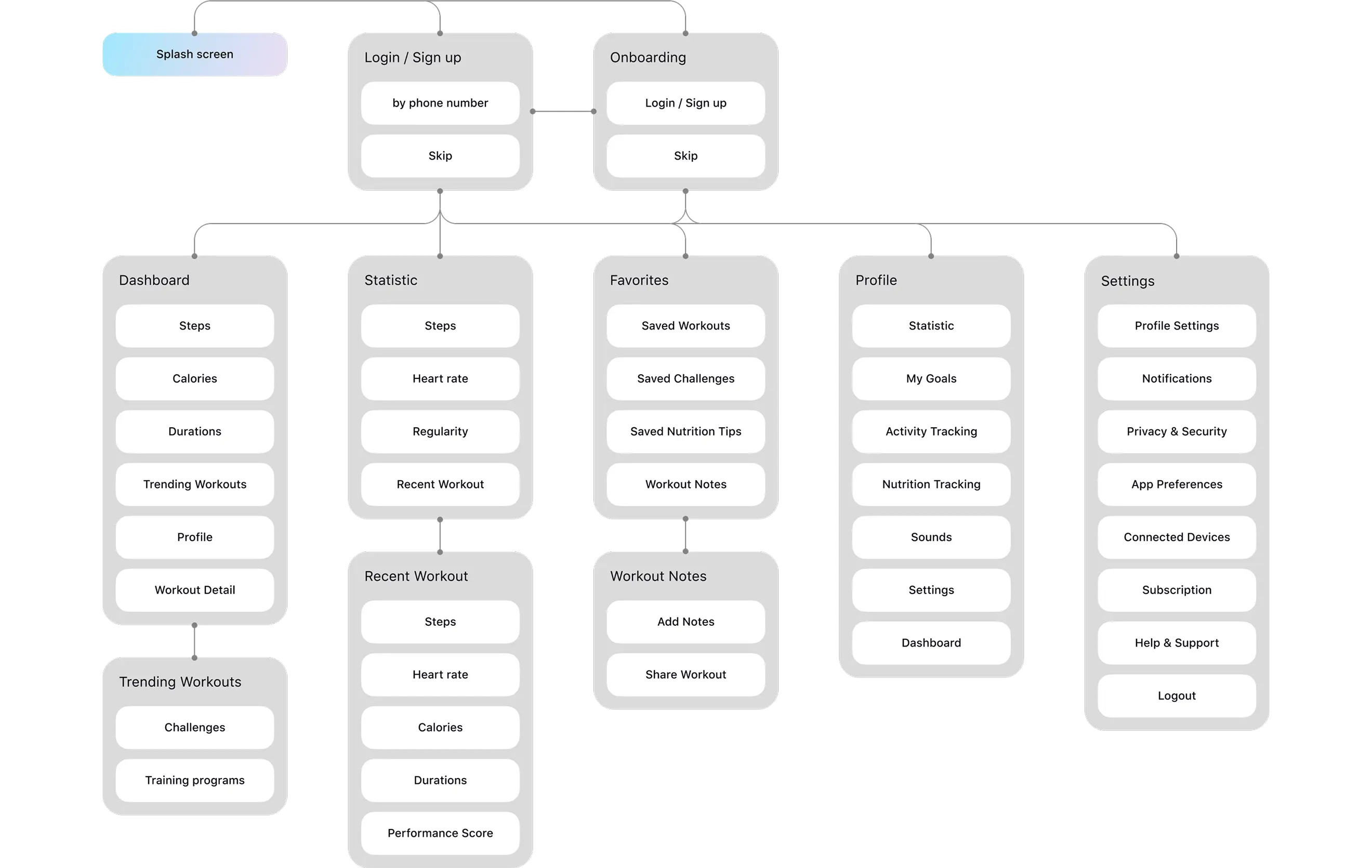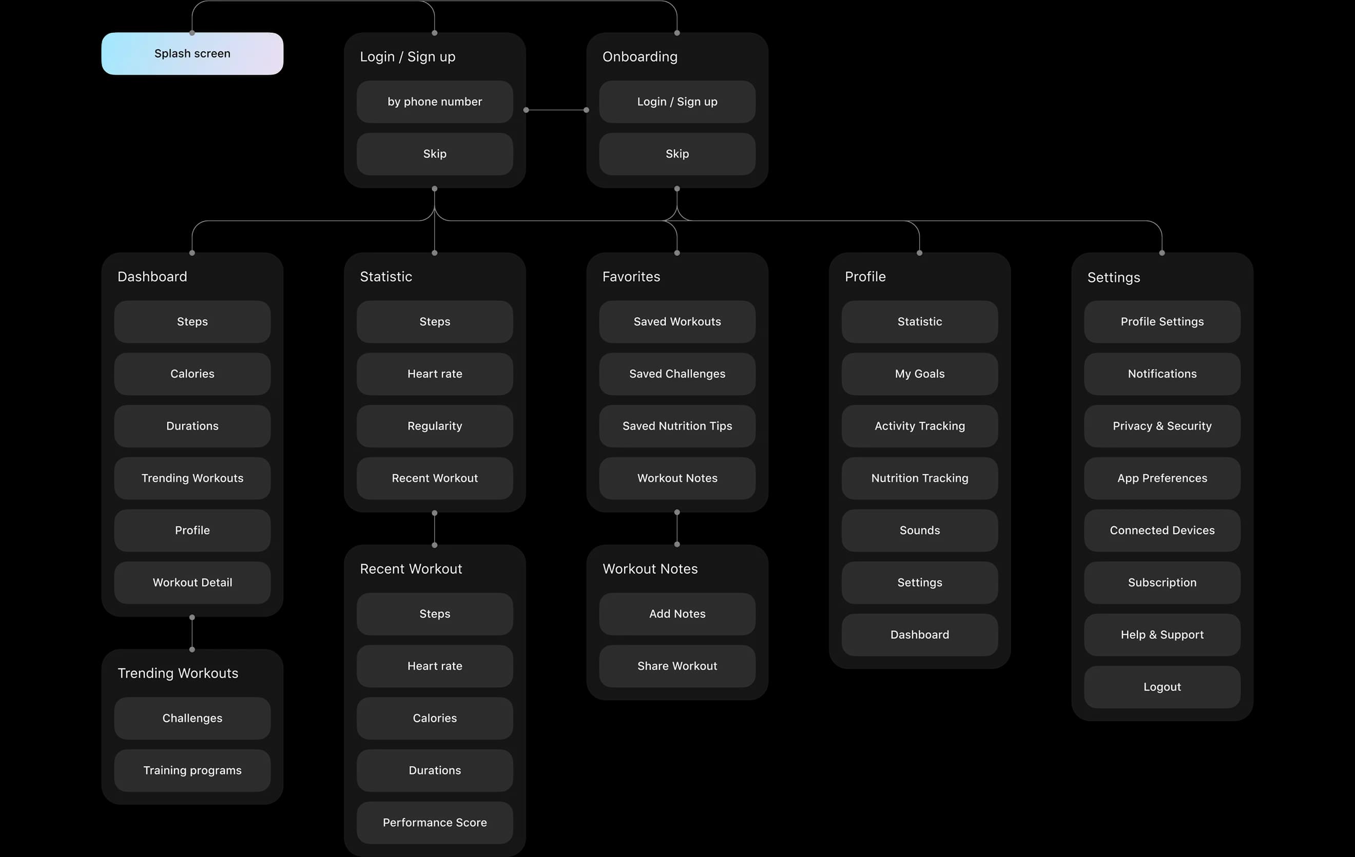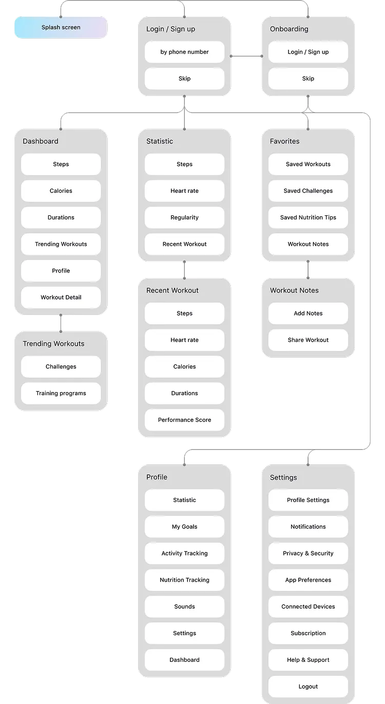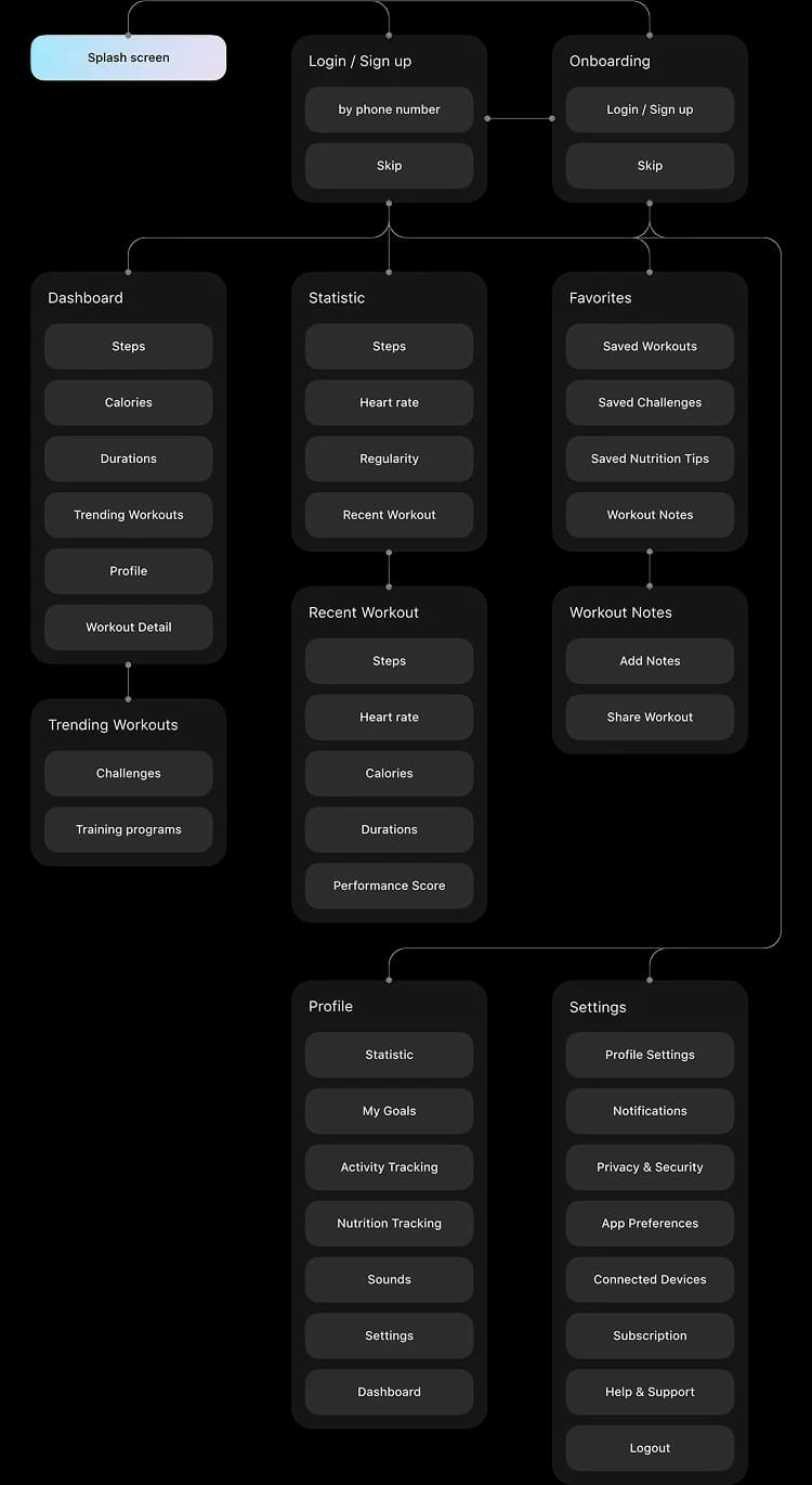 User journeys were optimized for quick access to core features like daily progress, trending workouts, and profile management. Clear separation of dashboards, statistics, and workouts prioritizes usability. The platform’s navigation is optimized for both one-handed mobile use and efficient web browsing.