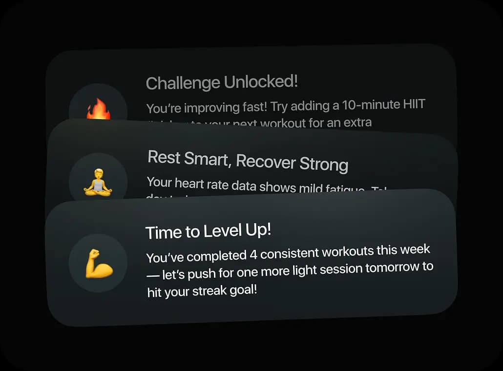 A lightweight AI module scans each user’s recent activity and offers simple, personalized advice — such as adjusting workout durations, suggesting a rest day, or proposing new challenges. The AI also nudges users to meet their goals and celebrates milestones.