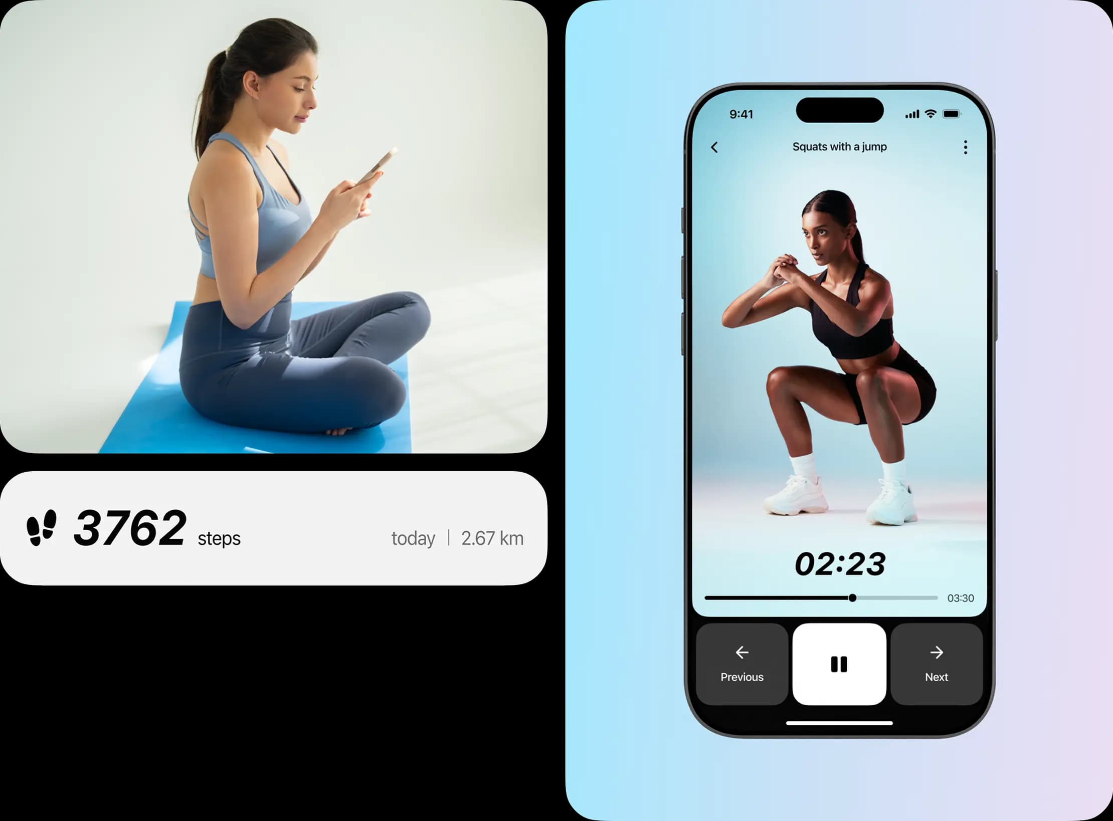 Each area — steps, calories, heart rate, nutrition — features visualized trends and actionable feedback. Workouts are broken into short, goal-oriented challenges, with timers and progress tracking directly in the player.
