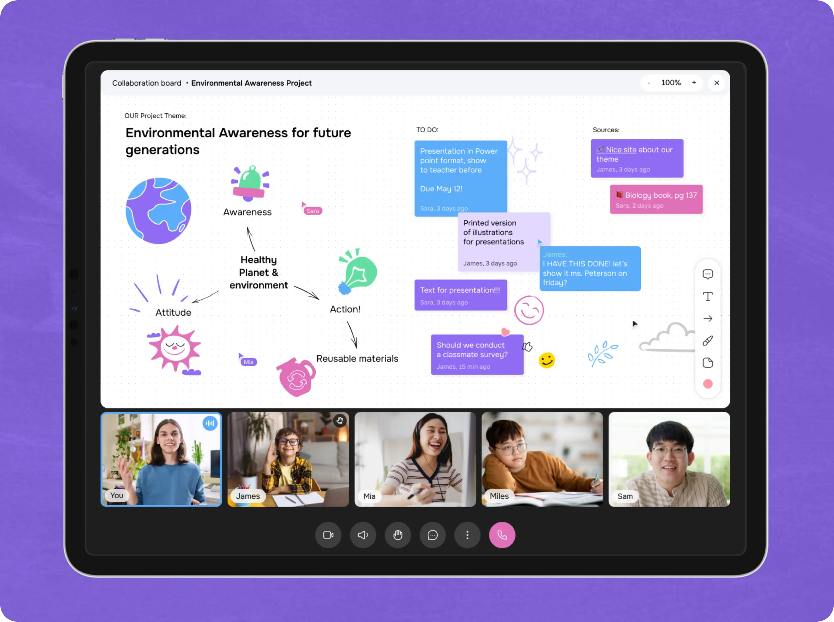 Both teachers and students can draw, write, and share ideas together on a digital whiteboard during lessons. Changes appear instantly for everyone.