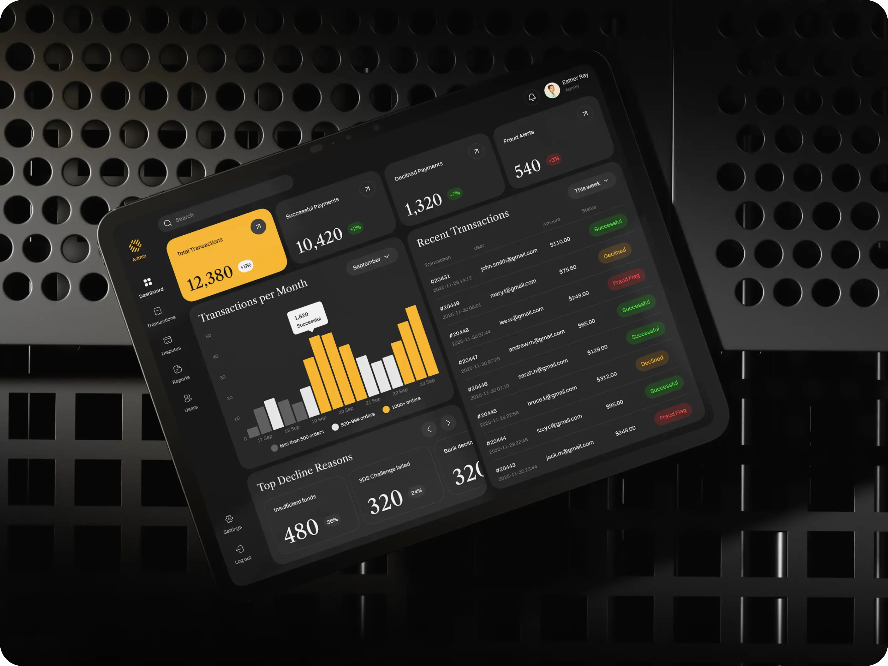 We built a simple admin panel where our client can control fraud settings and payment rules on their own, without waiting for developers. The dashboard gives clear, real-time reports on important numbers, like how many payments are approved, how often users need extra verification, how fast payments are processed, and how many fraud or chargeback cases happen.