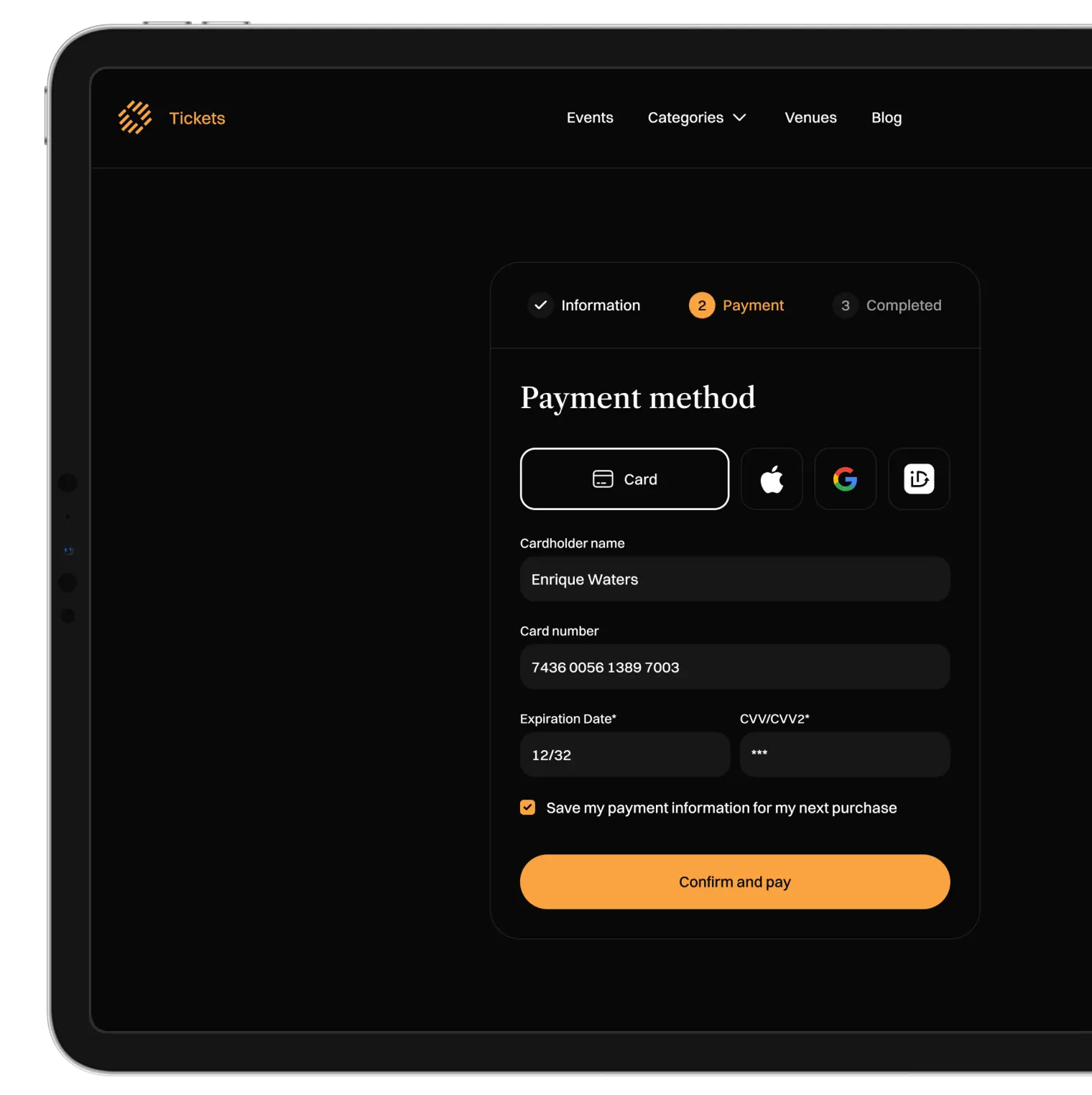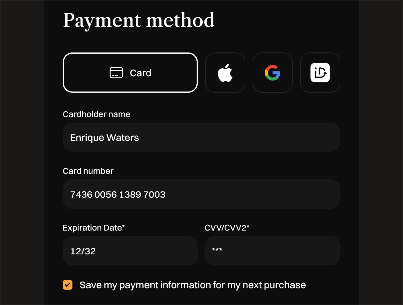 The card form is short and easy, with instant error checks. We never store full card numbers; everything goes through the payment provider for safety. We aligned the visual style with the platform’s design.