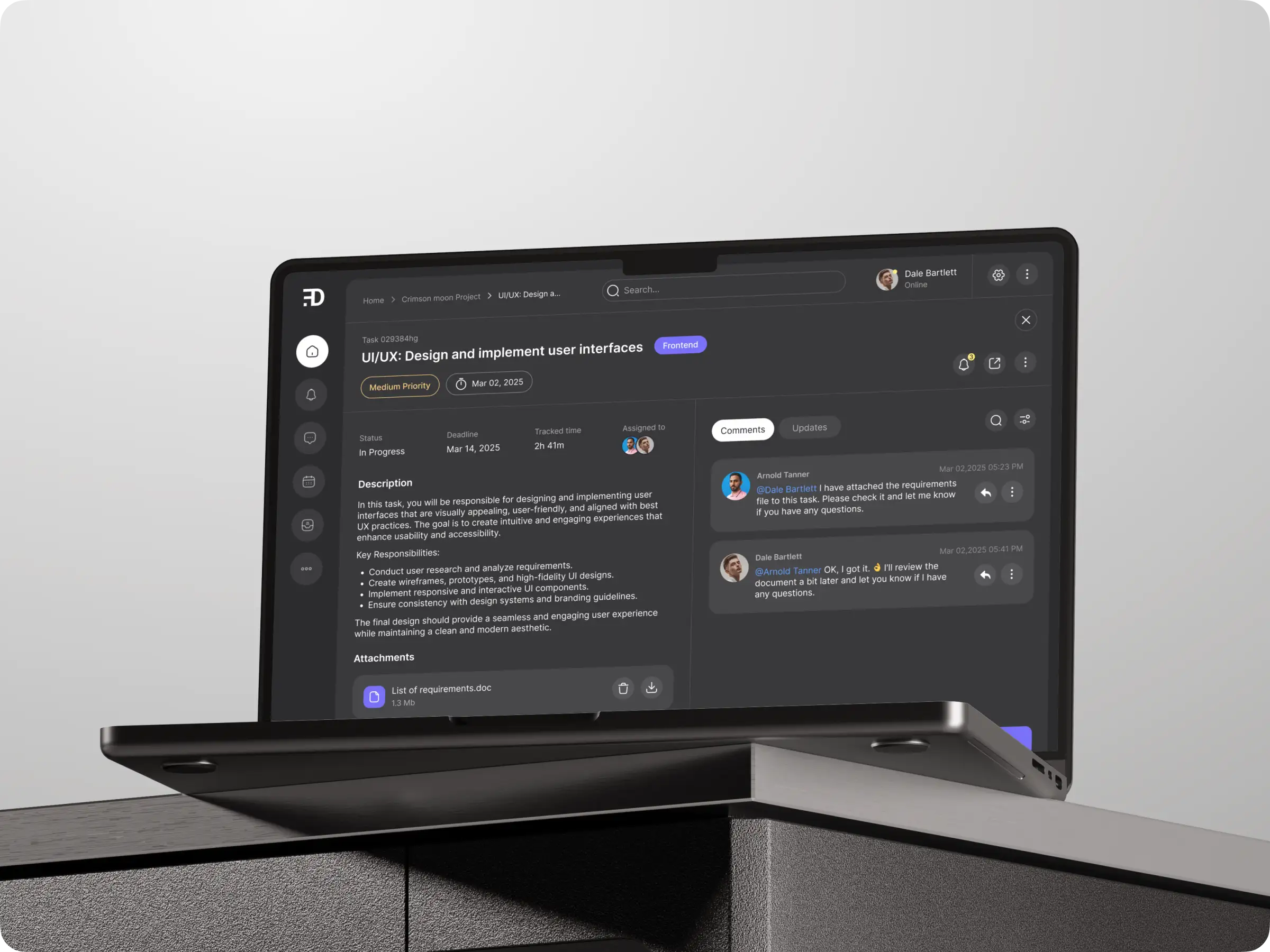 Each task offers space for detailed descriptions, supporting documents, subtasks, and checklists. Users can attach relevant files, add notes or requirements, and break work into actionable steps. Drag-and-drop uploads, integrated file previews, and deadline management tools make all project details not just stored — but easy to update and reference.