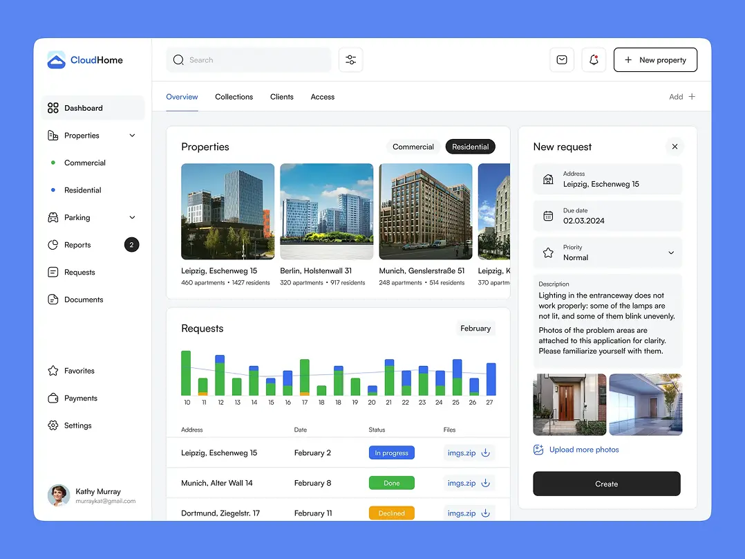 Our team worked with the owner of a residential complex who needed property management software to organize maintenance and repair tasks from residents. Our goal was to create a web panel. in addition to making an interface mockup, we needed to design a concept to agree on the visual style and animations to make the task management flow of the property management app clear.